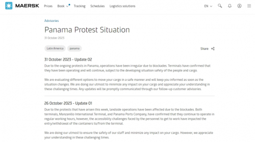 馬士基10月30日發(fā)布公告警告:“由于巴拿馬持續(xù)不斷的抗議活動(dòng),運(yùn)營(yíng)因封鎖而變得不正常。”
